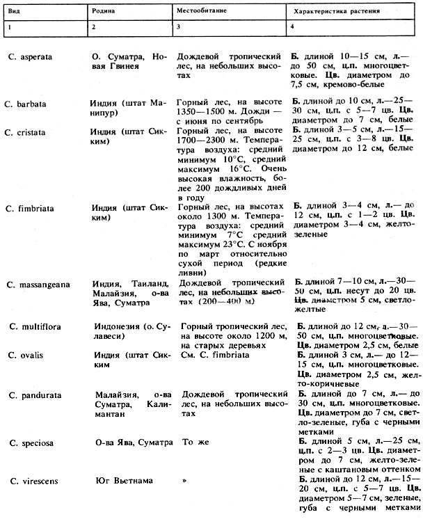 Таблица 14. Род целогина. Характеристики видов и местообитаний