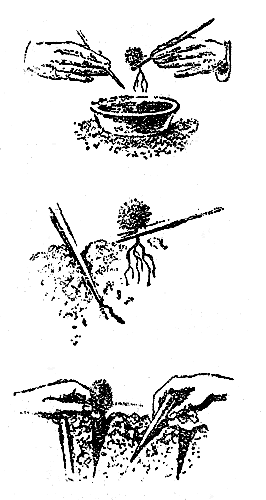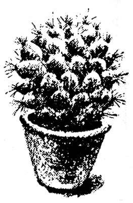 Через месяц после появления всходов пикируют сеянцы кактусов, то есть пересаживают их с отщипанным кончиком корня в другие плошки на расстоянии двух сантиметров друг от друга. При помощи деревянных палочек или пинцета (Каждый сможет сделать себе пинцет из палочки, утолщенной с одной стороны и заостренной с другой. Палочка с заостренной стороны расщепляется так, чтобы расщеп не доходил до тупого конца на 2 см. В расщеп вставляется кусочек дерева. немного тоньше спички, для того чтобы концы пинцета разошлись и пружинили) осторожно переносят сеянцы с небольшим комочком земли в приготовленные в другой плошке ямки. ямку нужно делать такую, чтобы сеянец можно было бы опустить до самых семядоль, не подвертывая корня.