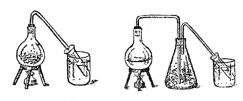 Листья нужно разрезать и положить в колбу, на дно которой налито немного воды. Колбу закрыть пробкой с длинной стеклянной трубкой, опускающейся вниз под углом. Конец трубки поместим в пробирку или пузырек, опущенный в стакан с холодной водой.