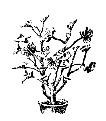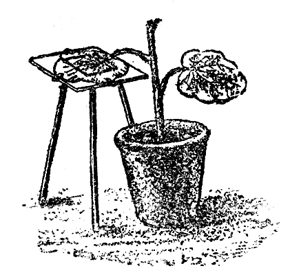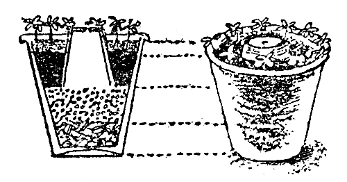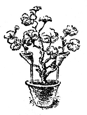Посаженные таким образом черенки, как известно, покрывают стеклянным колпаком или банкой. Черенки пеларгонии дают корешки дней через двадцать. Их можно сажать в горшки не только наискось, но и прямо, но для этого нужно к ним "приблизить воздух". А это делается так. Маленький горшок ставится вверх дном в большой. Между стенками обоих горшков насыпается влажный песок. К черенкам воздух поступает сквозь пористые стенки обоих горшков.