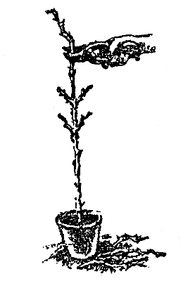 Во влажном песке, насыпанном в плошку или горшок, палочкой делают вкось углубление и вводят в него черенок почти наполовину. Песок плотно обжимают.