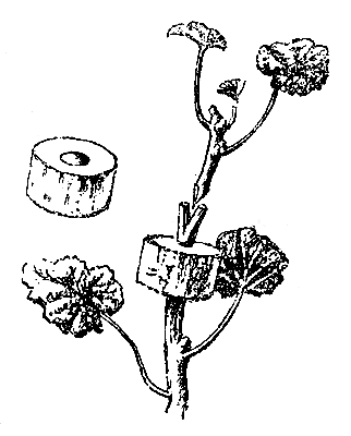 Срезы должны быть ровными и не очень крутыми. Прививаемый черенок называется привоем, а растение, к которому прививается черенок, - подвоем. Подвоем выберем пеларгонию другого сорта и срежем у нее верхушку одного из стеблей. На пеньке стебля сделаем посредине надрез в 1 или 1,6 сантиметра, то есть немного больше, чем срез черенка, В этот надрез осторожно введем клинышек черенка так чтобы обе половины стебля подвоя совсем закрыли боковые срезы черенка - привоя.