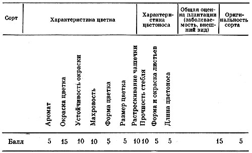 Всем сортам была дана оценка комиссией по 100-балльной системе (см. схему), разработанной в ГБС АН СССР, где учтены основные качества гвоздики.
