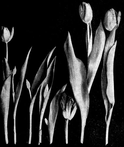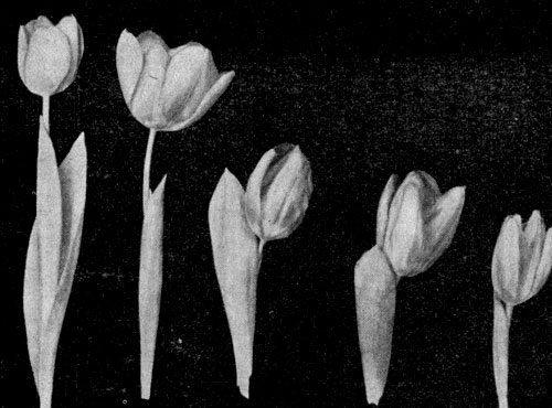 В табл. 2 представлены данные выгонки I партии тюльпанов в 1972—1975 гг., где указаны сроки цветения испытанных сортов, высота растений и число (в %) нормально развитых цветков.