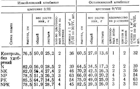 Опыты в Измайловском и Останкинском комбинатах декоративного садоводства, в которых удобрения вносились в разных сочетаниях по фазам роста, показали, что наивысшая продуктивность гвоздики в Измайловском комбинате получена от систематического внесения азотно-фосфорных и фосфорно-калийных удобрений. В этом случае с 1 м2 срезано за один месяц (с 27/III — 30/IV) до 63—54 шт. цветоносных побегов (табл. 7). При внесении удобрений в Других сочетаниях заметно понижена продуктивность гвоздики. В Останкинском комбинате высокой продуктивностью отмечалась гвоздика, под которую вносились фосфорно-калийные и азотно-калийные удобрения. За август с 1 м2 было срезано по 56—63 цветоносных побегов. Гвоздика, под которую вносились азотно-фосфорные и азотно-фосфорно-калийные удобрения, давали 52—54 цветоносных побега с 1 м2. Эти данные в 1,5 раза выше контрольных.