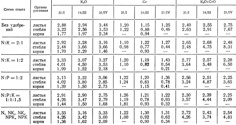 Опыты показали, что если в цветоносных побегах содержится очень высокое количество К2О (до 4—5%), то поступление кальция, как правило, замедляется, не поднимается выше 0,6—0,8%, что ведет к резкому увеличению отношения К2О:Са.